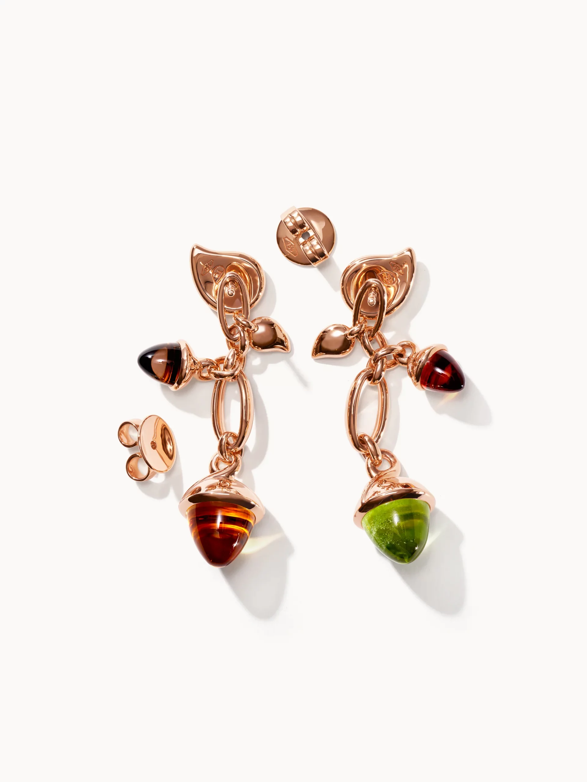 Dieser neue Ohrringstil ergänzt unsere ikonische Mikado-Kollektion perfekt. Dank des abnehmbaren Unterteils bietet dieses Ohrring-Design vielseitige Tragemöglichkeiten: lange, baumelnde Ohrringe, ein Ohrstecker für den Alltag und Anhänger, die an einer Kette getragen werden können. Allein das Tragen der Ohrringe ergibt einen lässig-eleganten Look. In der Color Story Indian Summer wird ein glänzender Peridot mit einem Citrin Palmeira und ein Citrin Madeira mit einem Rauchquarz kombiniert.